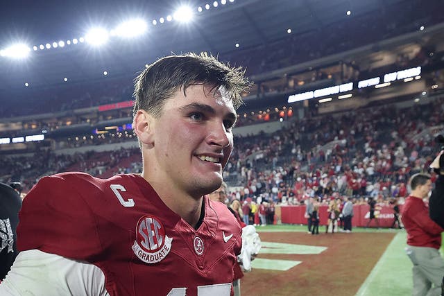 Ty Simpson #15 of the Alabama Crimson Tide threw for 277 yards and a touchdown in his team’s win over LSU. (Photo by Kevin C. Cox/Getty Images)