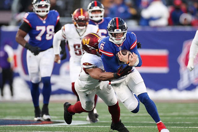 Jaxson Dart #6 of the New York Giants runs the ball against Bobby Wagner #54 of the Washington Commanders during the fourth quarter at MetLife Stadium on December 14, 2025 in East Rutherford, New Jersey. (Photo by Evan Bernstein/Getty Images)