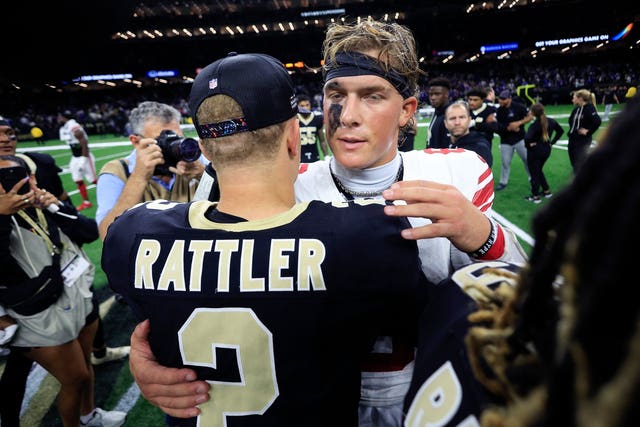 Spencer Rattler (No. 2) finally got a win as an NFL starter, but it took playing a team lower than his Saints in the power rankings. (Sean Gardner/Getty Images)