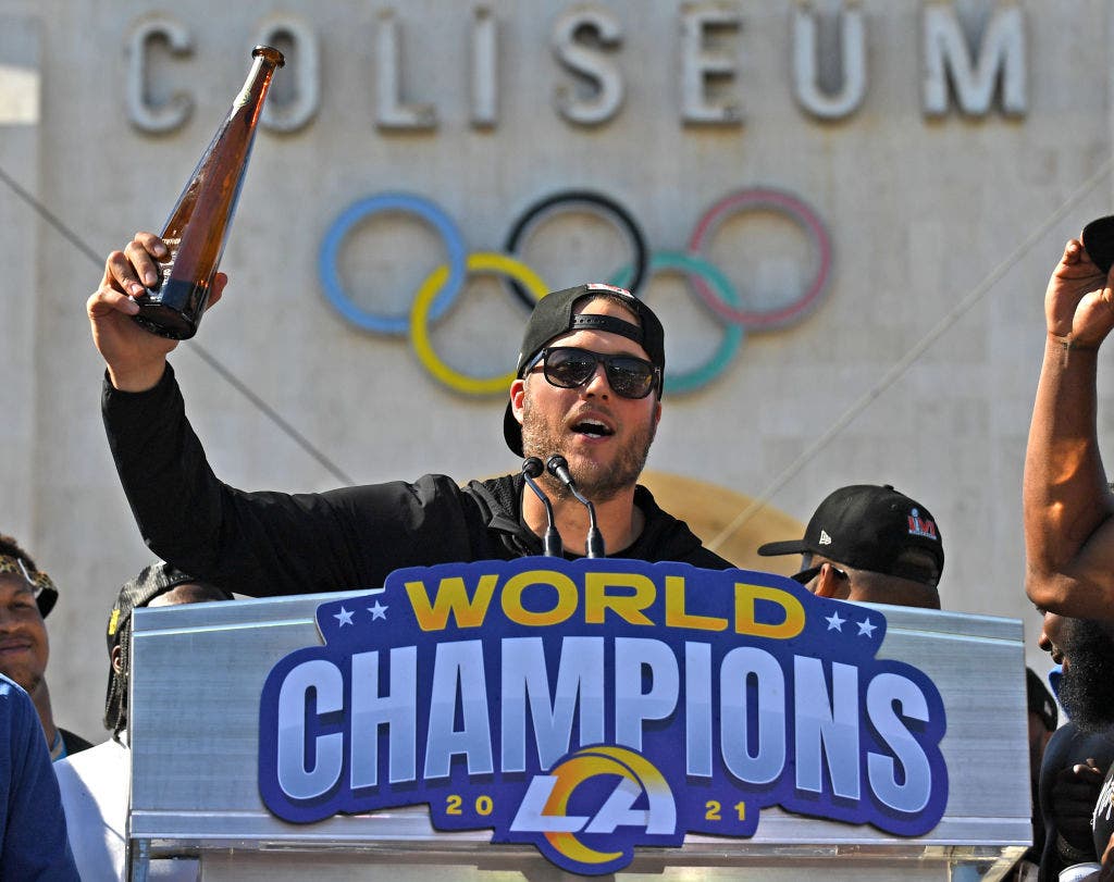 Stafford celebrates the Rams’ Super Bowl championship in front of the Coliseum in 2022. (Wally Skalij/Los Angeles Times via Getty Images)