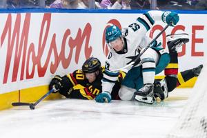 VANCOUVER – The bright glow of a two-goal performance by Elias Pettersson was dimmed a little when the Vancouver Canuck centre left Monday’s 4-3 win over the San Jose Sharks early in the third period.
