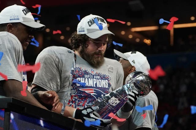 Center for the New England Patriots David Andrews holds the trophy after winning Super Bowl LIII against the Los Angeles Rams at Mercedes-Benz Stadium in Atlanta, Georgia, on February 3, 2019. (Photo by TIMOTHY A. CLARY / AFP) (Photo credit should read TIMOTHY A. CLARY/AFP via Getty Images)
