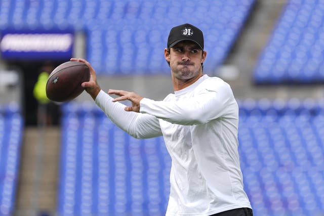 Daniel Jones #17 of the Indianapolis Colts warms up prior to an NFL preseason football game against the Baltimore Ravens at M&T Bank Stadium on August 07, 2025 in Baltimore, Maryland. (Photo by Perry Knotts/Getty Images)
