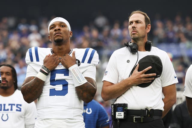 Anthony Richardson Sr. #5 of the Indianapolis Colts and head coach Shane Steichen stand for the national anthem prior to an NFL Preseason 2025 game against the Baltimore Ravens at M&T Bank Stadium on August 7, 2025 in Baltimore, Maryland. (Photo by Logan Bowles/Getty Images)