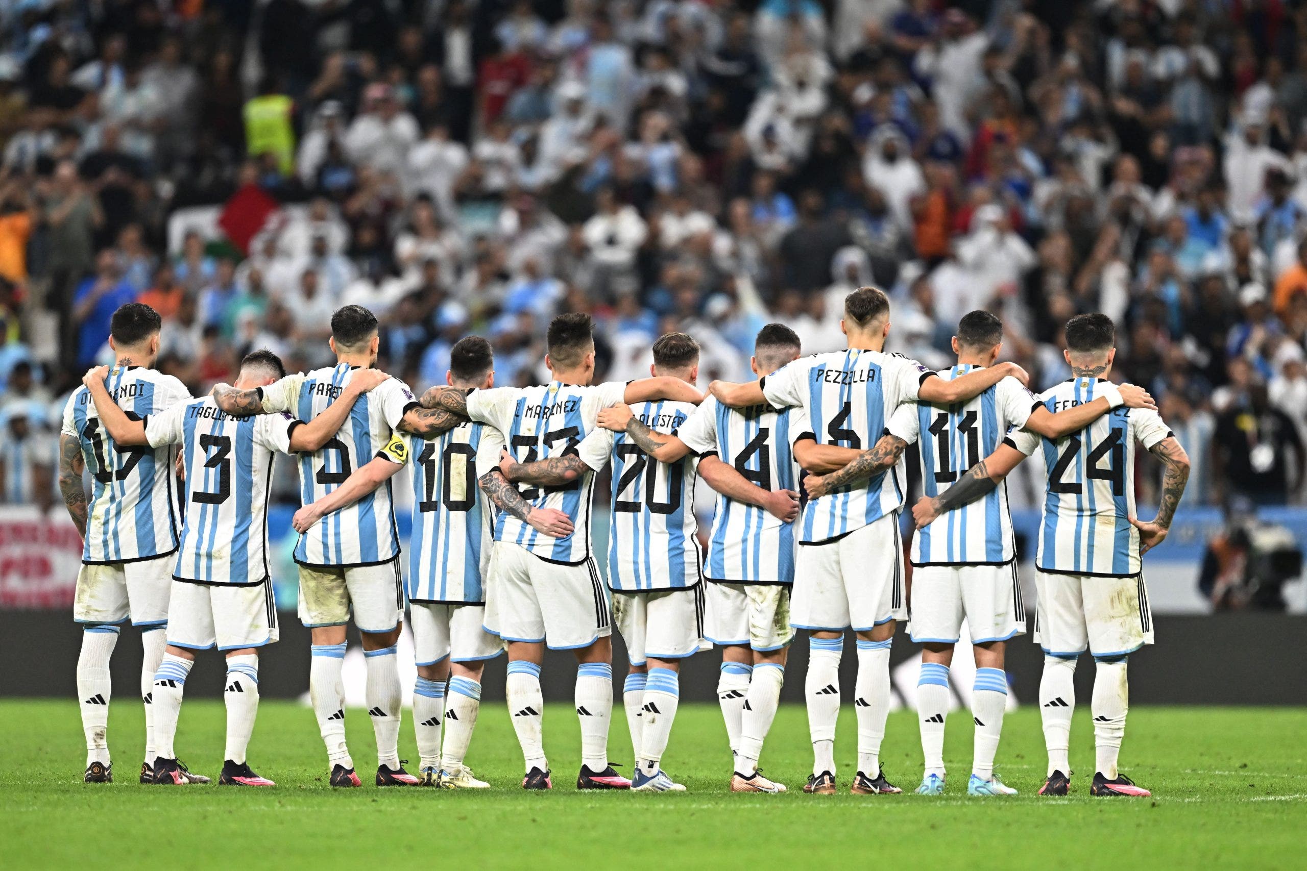 Argentina’s players gather during the shootout after extra time of the 2022 World Cup quarterfinal against the Netherlands. (Photo by MANAN VATSYAYANA/AFP via Getty Images)