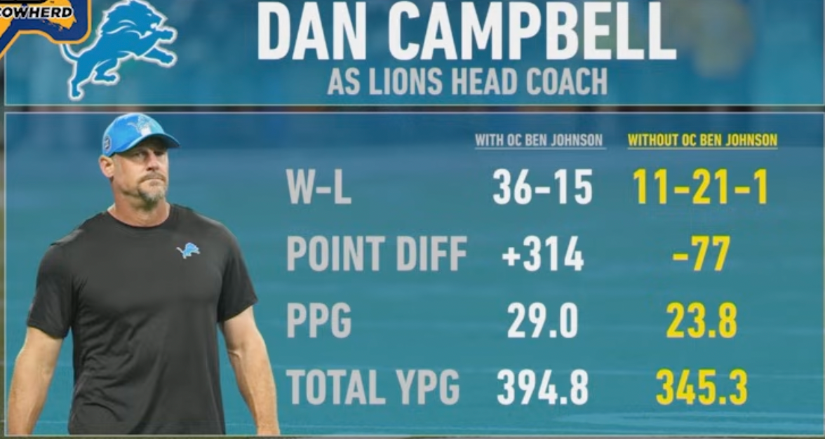 That’s exemplified by the fact that Campbell is 36-15 with former offensive coordinator and current Chicago Bears head coach Ben Johnson and 11-21-1 without him. So, to keep the Lions’ Super Bowl hopes high moving forward, Cowherd thinks they must find another elite offensive mind to replace Johnson.