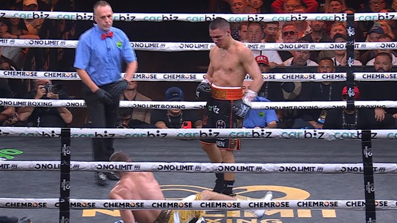 Tim Tszyu is split open under his eye following a head clash with Denis Nurja in the fourth round.
