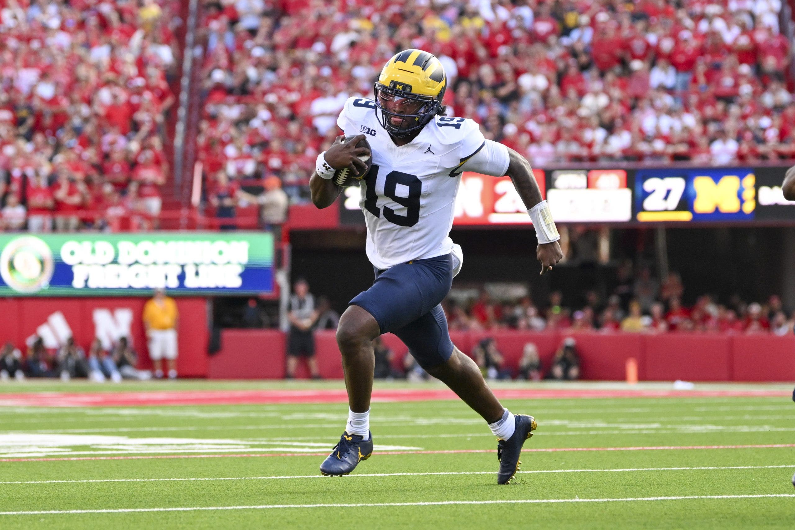 Michigan QB Bryce Underwood (19) runs the ball against Nebraska at Memorial Stadium. (Photo by Kevin Langley/Icon Sportswire via Getty Images)