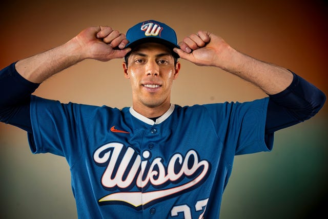 “A water-toned base and cream accent evoke Wisconsin’s endless lakes, sandy shores and sandstone bluffs, while a gradient wordmark captures the state’s beautiful summer sunsets. A ‘Wisco’ wordmark on the chest, state motto on the collar, bobber jock tag detail and redesigned Barrelman sleeve patch round out a uniform that celebrates the team’s history and Wisconsin’s rich heritage.”