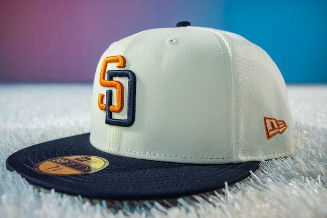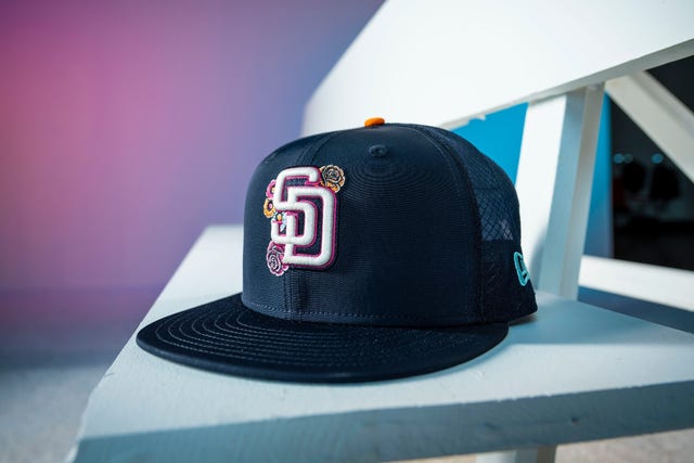 “Celebrating the Padres’ bi-national region and culture through honoring its traditions and families with a focus on Día de los Muertos, the design features a sunset-ombre ‘San Diego’ chest wordmark, La Catrina sleeve patch, marigold-patterned trim, bone colored hat and pants, and papel picado jock tag.”