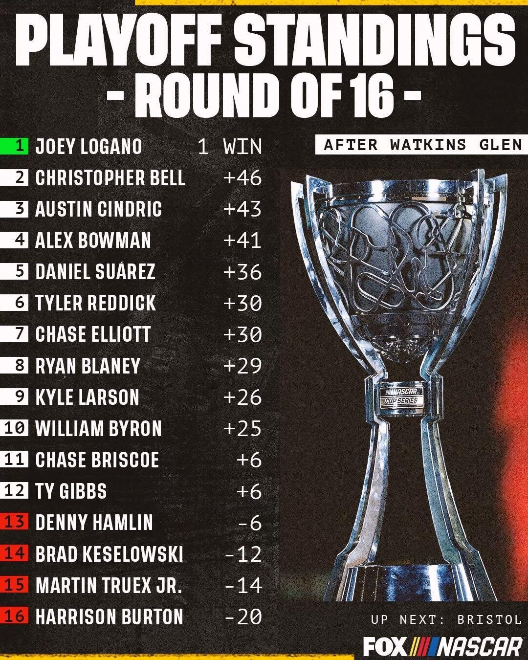 Denny Hamlin was involved in two accidents, including one on the opening lap, finished 23rd and is six points behind Ty Gibbs and Chase Briscoe, who are currently tied for the final two spots.
