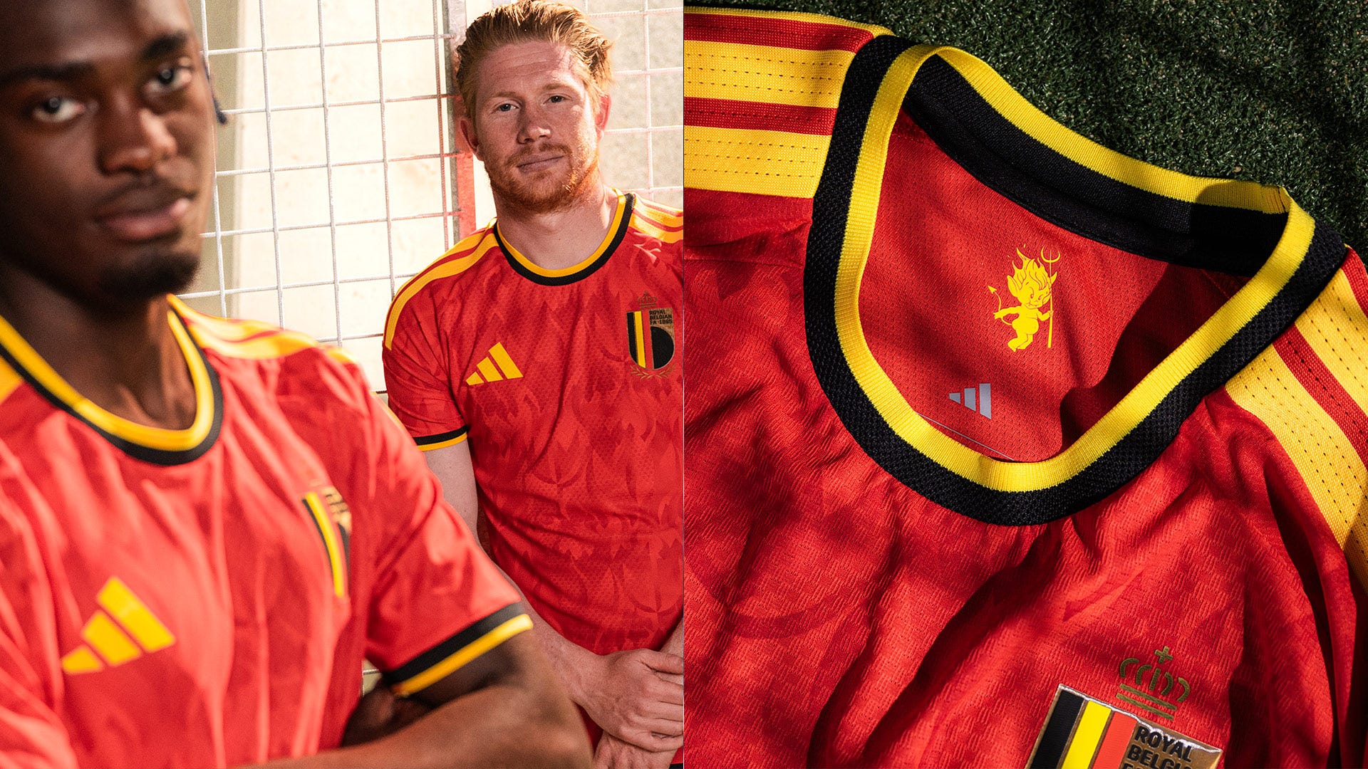 Belgium’s home kit takes inspiration from the prominent Gothic stained-glass windows found across the country, with icons representing the Red Devils, and the Red Flames, the respective nicknames of the men’s and women’s teams.