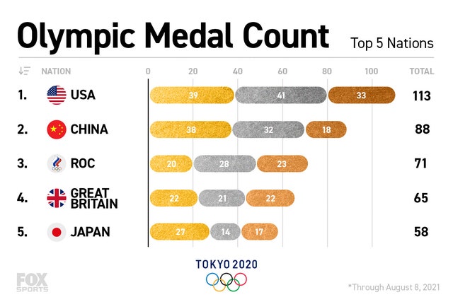 The U.S. finishes the Games with 113 medals (39 gold, 41 silver and 33 bronze), followed by China with 88 total medals (38 gold, 32 silver and 18 bronze) and ROC with 71 total medals (20 gold, 28 silver and 23 bronze).