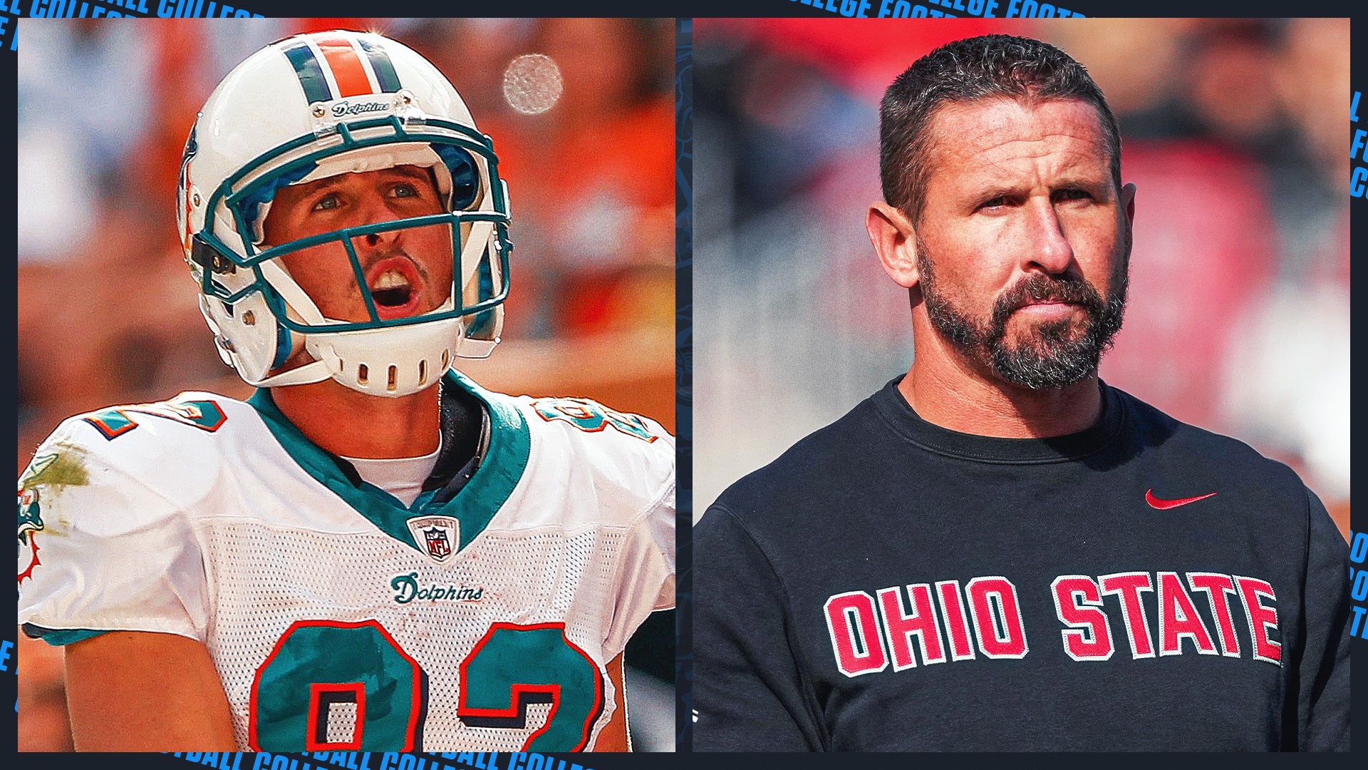 Before becoming Ohio State’s wide receivers coach and offensive coordinator, Brian Hartline was a standout receiver in the NFL for seven seasons. (Photo credits: Mike Ehrmann/Getty Images, Jason Mowry/Getty Images)