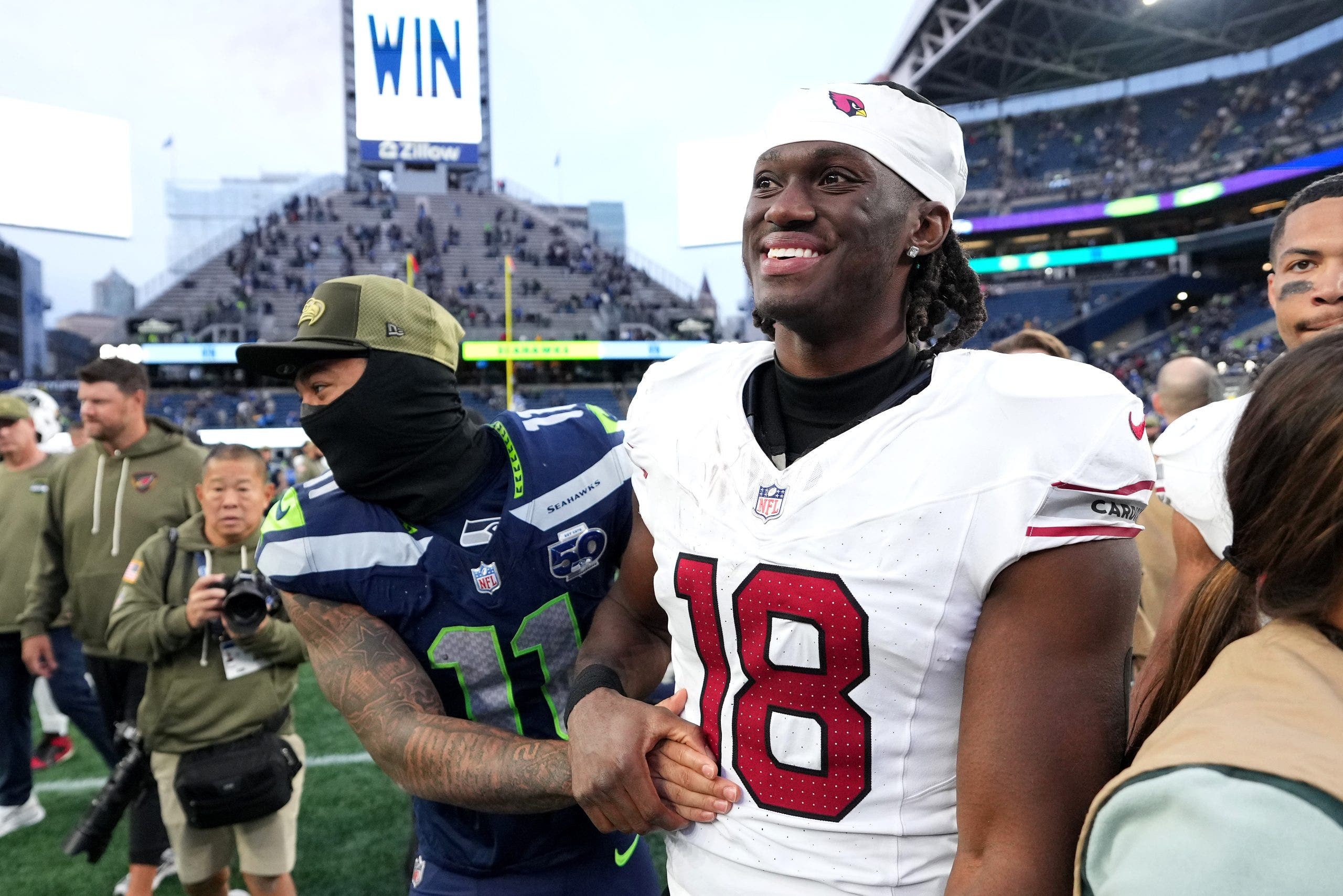 Jaxon Smith-Njigba and Marvin Harrison Jr. shared some laughs following the Seahawks’ Week 10 win over the Cardinals, but there hasn’t been a jersey swap between the two yet. (Photo by Soobum Im/Getty Images)
