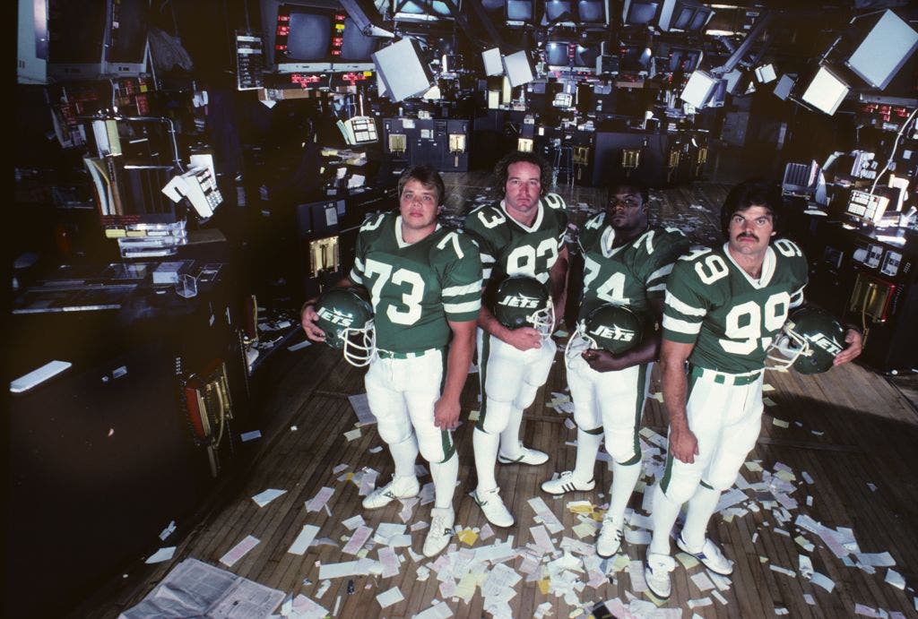 Members of the New York Jets’ “Sack Exchange” posed on the floor of the New York Stock Exchange in 1982: Joe Klecko #73, Marty Lyons #93, Abdul Salaam #74 and Mark Gastineau #99. (Photo by Ronald C. Modra/Getty Images)